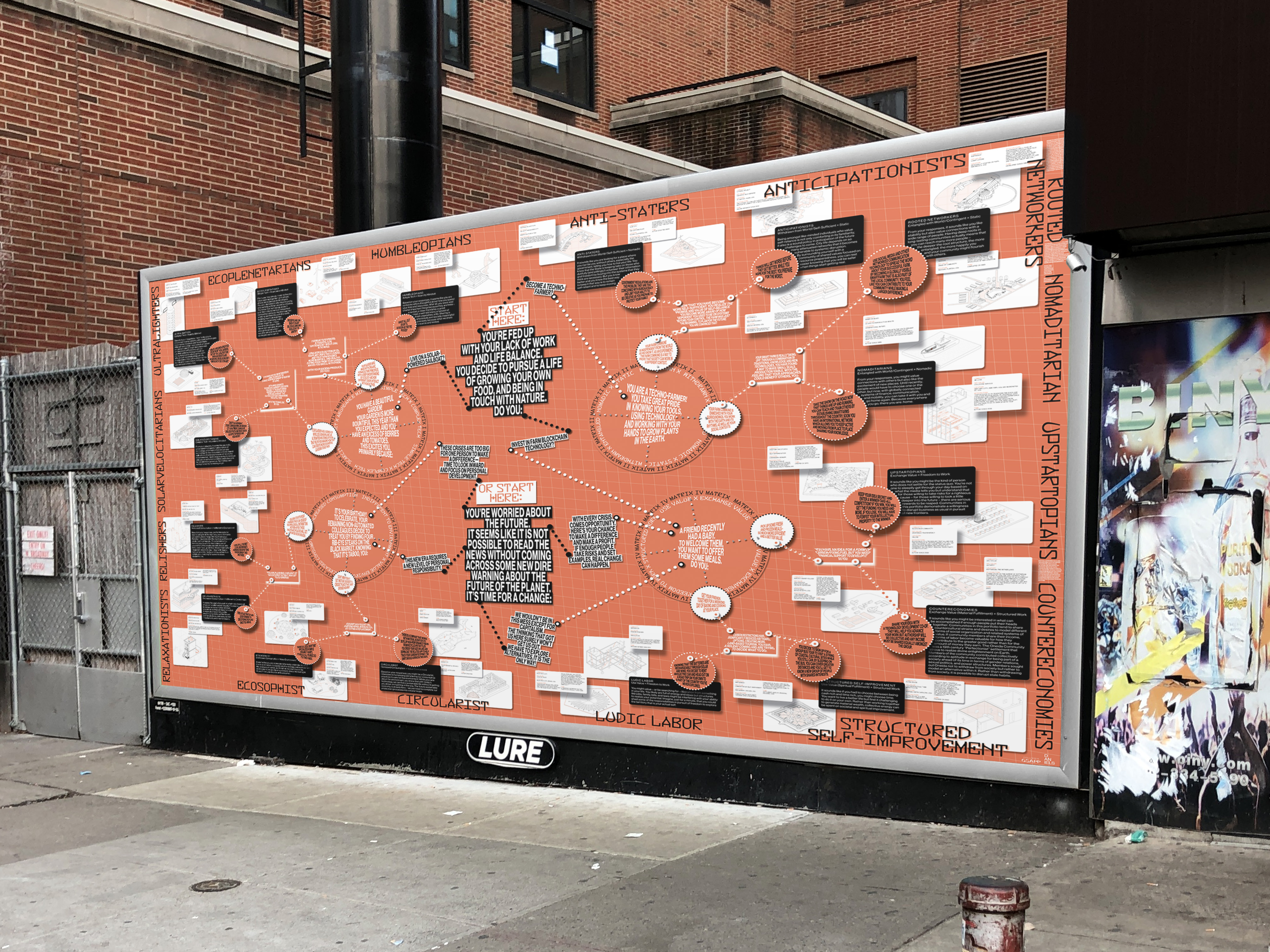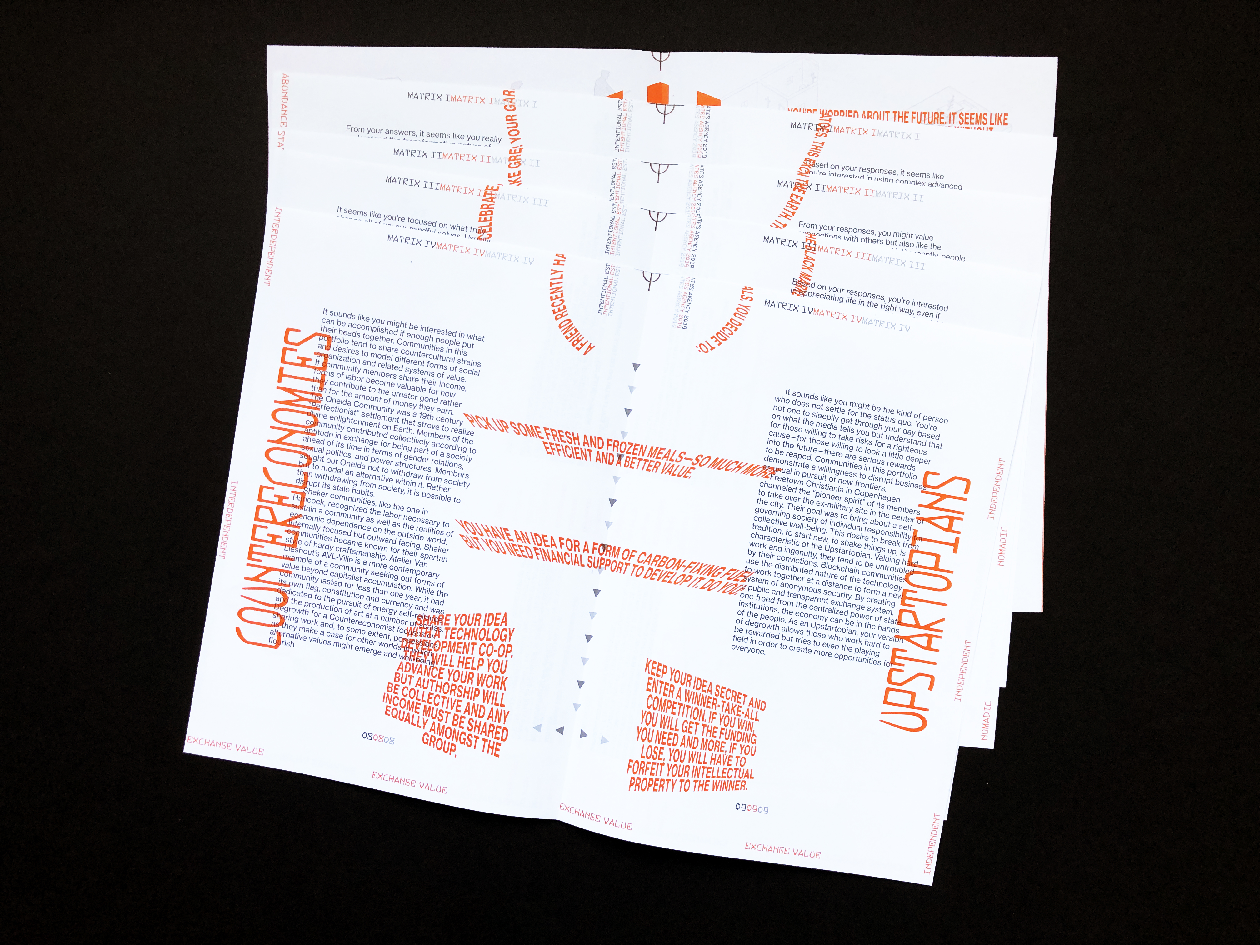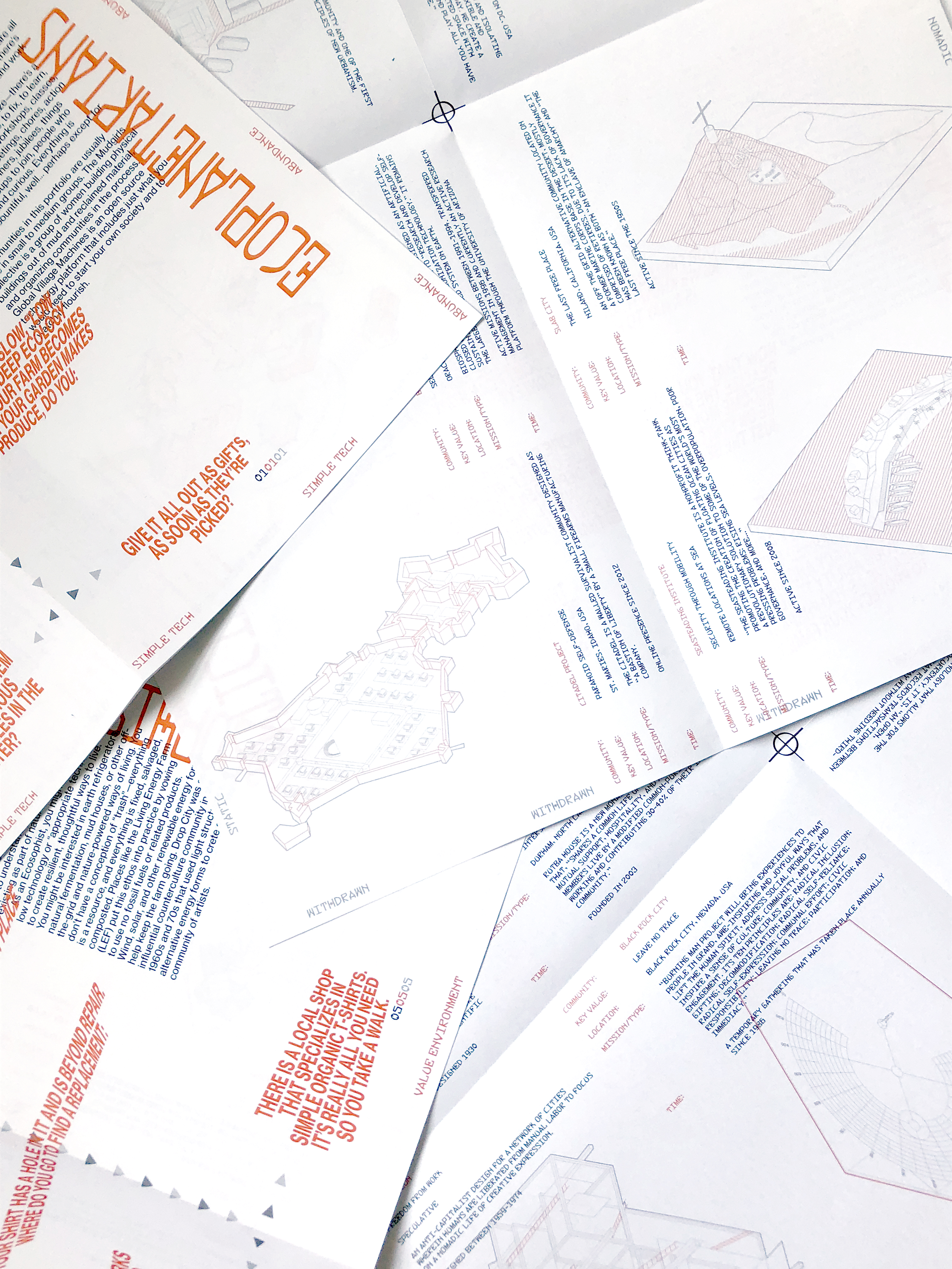 The Intentional Estates Agency [IEA] adopts and modifies the mechanisms of desire and commodity logic of a real estate agency to engage issues of degrowth. It offers a brochure of sixteen portfolios of degrowth options that draw from a catalog of historical, contemporary and speculative intentional communities and social experiments from around the world. Rather than an emphasis on cost, location or square footage, these portfolios foreground, for example, communal metrics, platforms for collective sharing, and resource management.