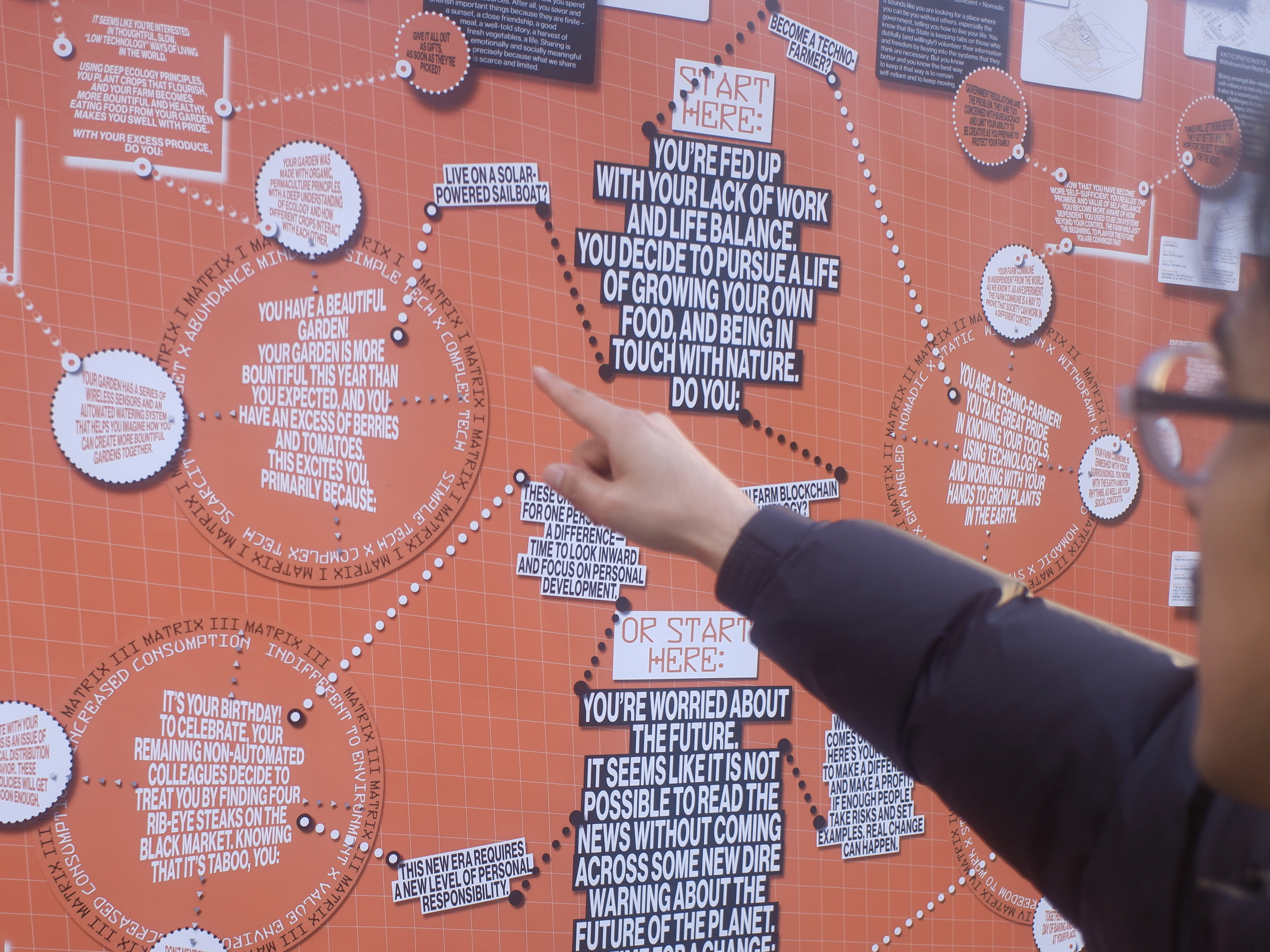 Designed as an interactive publication, the project prompts participants to discover a portfolio that might be suitable for them as a means to consider new forms of value outside of current habits, behaviors and the status quo. Participants navigate through a series of questions that pose value-based dilemmas towards four areas of concern (environment, labor, mobility and technology). Once in a matrix for an area of concern, participants are guided through another set of value-based questions towards a unique portfolio which houses exemplary (or counter-exemplary) degrowth case study options. The IEA supports the need to locate alternative pathways out of a paradigm of limitless growth and expand an empirical understanding of how design can support new forms of society and value systems.